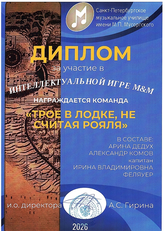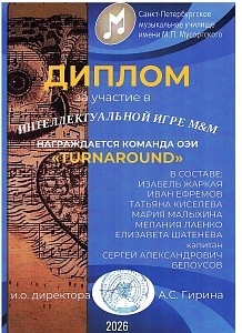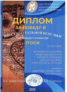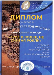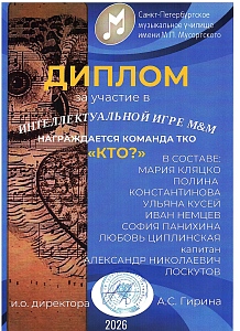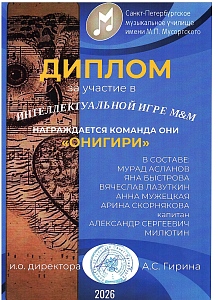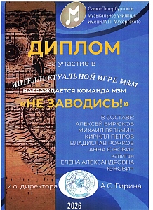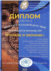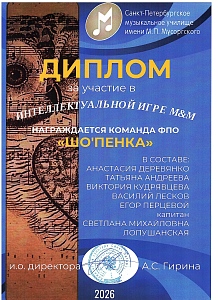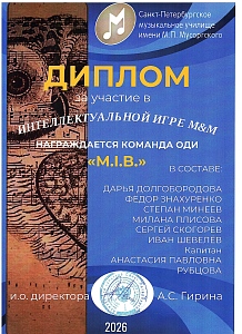Поздравляем команду оркестрового струнного отдела Л'ОСИ с победой в турнире команд обучающихся, их родителей, кураторов и преподавателей отделов музыкального училища Мусоргского "Интеллектуальная игра М&М"!